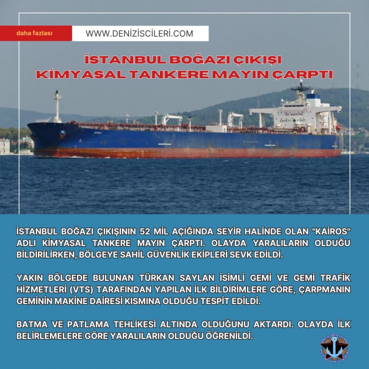 İstanbul Boğazı çıkışının 52 mil açığında seyir halinde olan "Kairos" adlı kimyasal tankere mayın çarptı. Olayda yaralıların olduğu bildirilirken, bölgeye Sahil Güvenlik ekipleri sevk edildi.